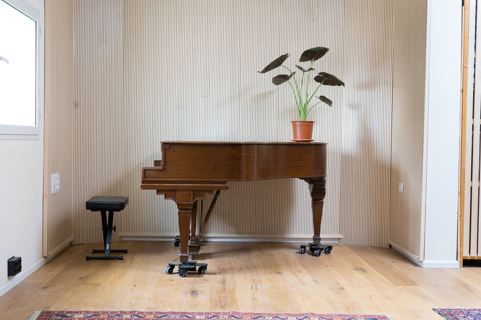 החדר נבנה בשיתוף יועץ אקוסטי וכולל קירות, ריצוף ודלתות מבודדי רעש, חיפויים מחורצים לפיזור נכון של הצליל בחלל ושפע מקומות אחסון.